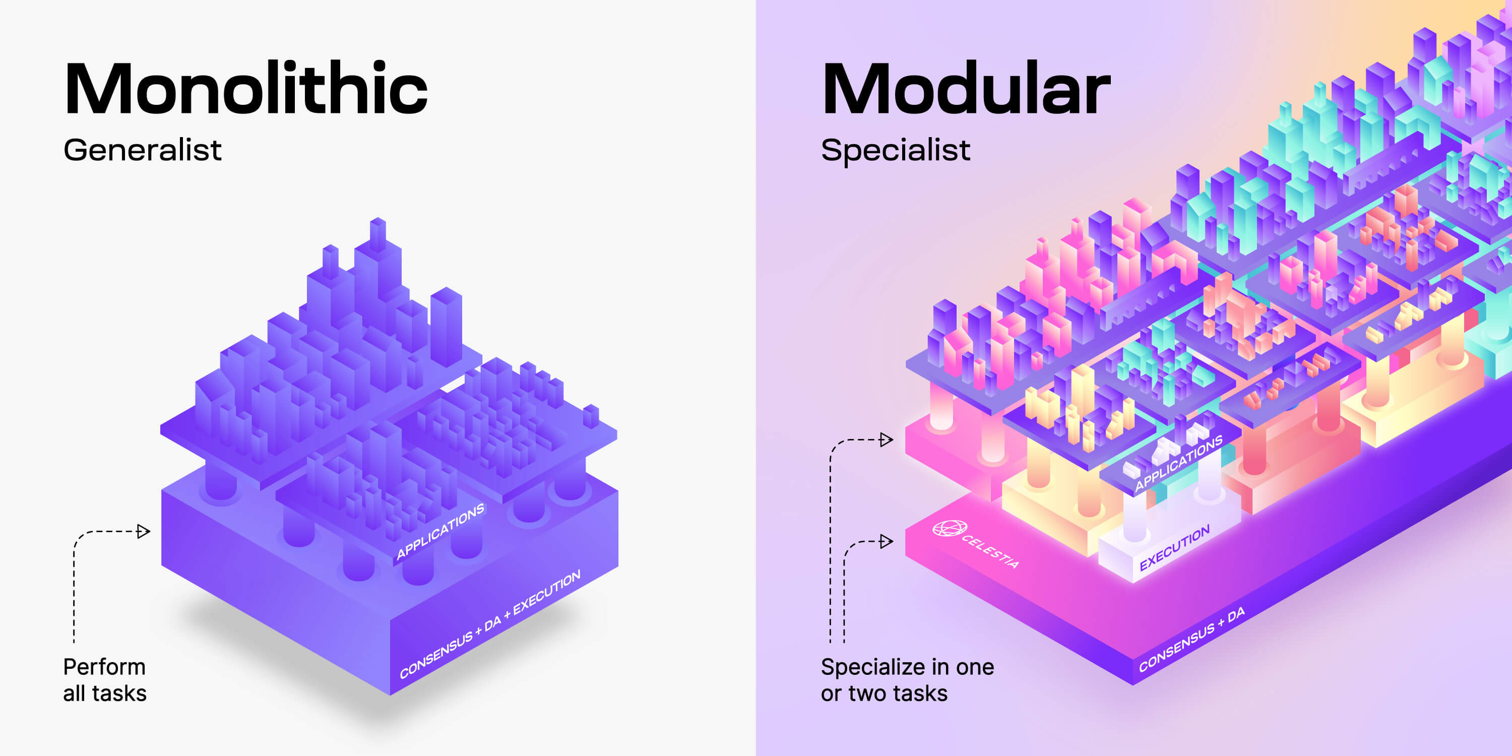 Well, modular blockchains are specialists. They perform only one or two tasks - the opposite of monolithic chains.