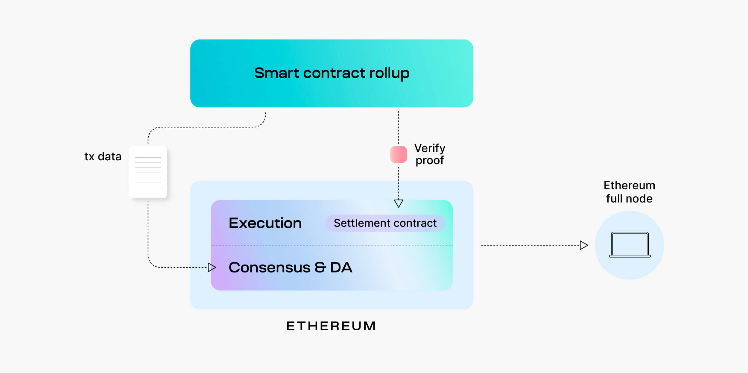 Using Ethereum as an example, in the modular stack the smart contract rollup is responsible for execution. It offloads the work of consensus, data availability, and settlement to Ethereum.