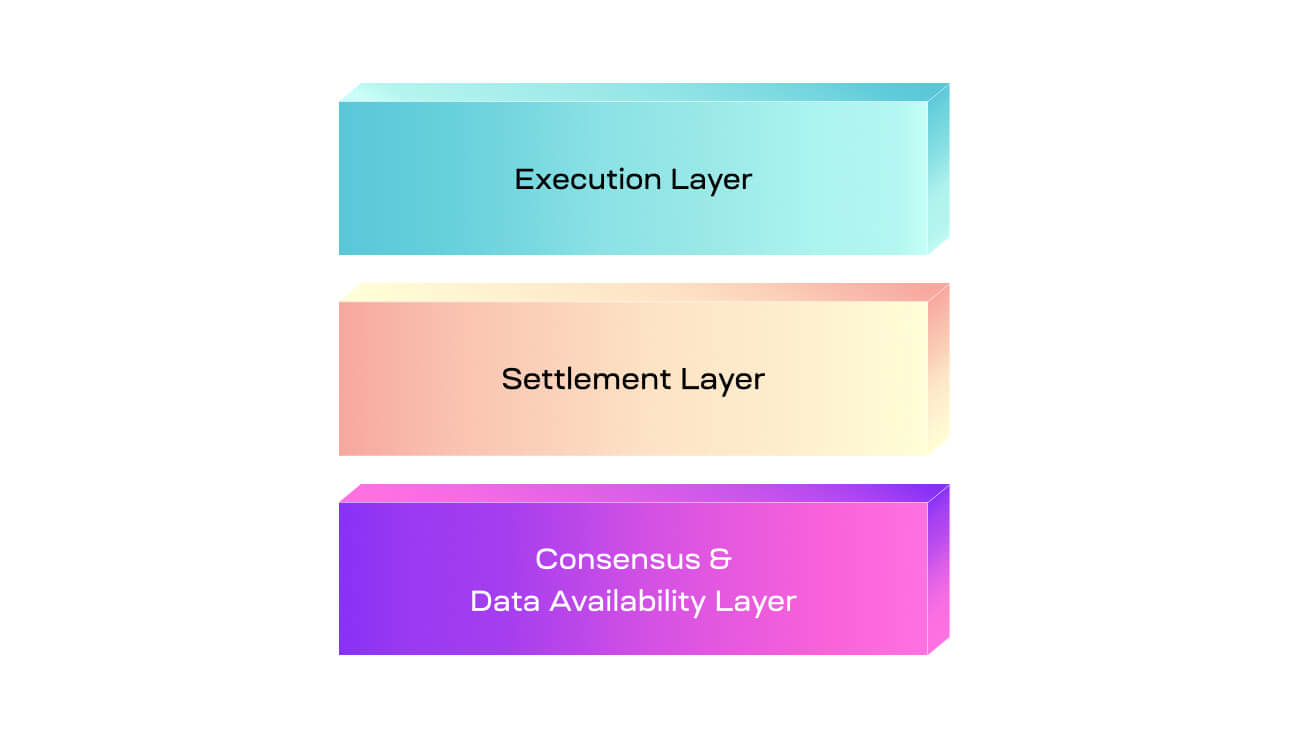 The execution layer sits at the top of the stack and plays the same role as layer 2 in the previous stack. Modular stacks beyond layer 1 and 2 are more flexible in their construction, requiring more specific naming that is coherent with the functionality that each layer provides.