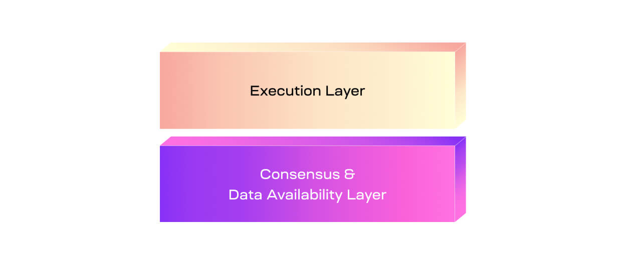 At the bottom of this construction is the consensus and data availability layer. As the name suggests, it only provides consensus over the order of transactions and verifies that their data is available. Because there is no execution functionality, only transaction data is published by the settlement layer rather than the contents of the entire block.